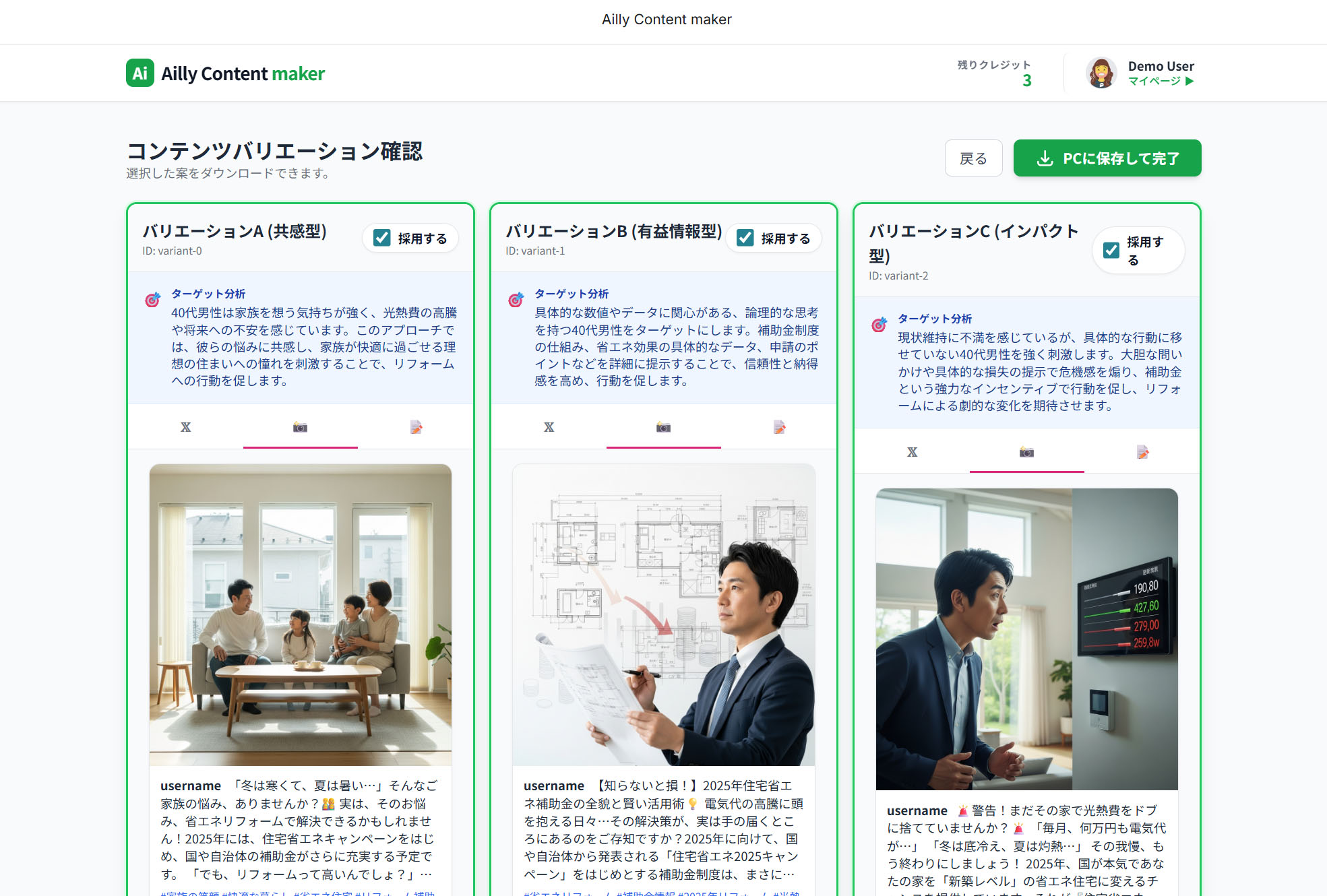 さらに「共感型」「有益情報型」「インパクト型」など、複数のアプローチで投稿パターンを生成。自分のブランドに合ったものを選べます。